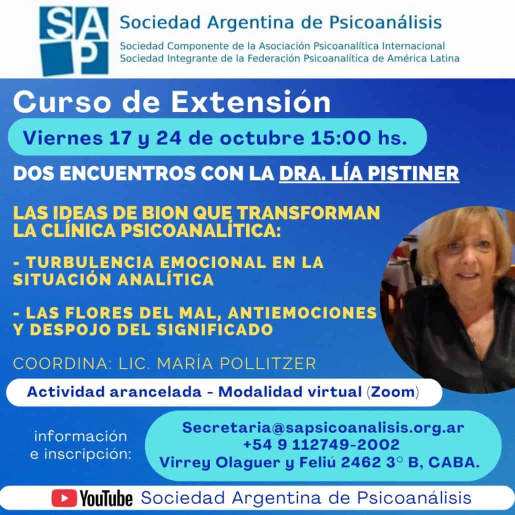 SAP-Editor2025-10-15 11:10:082025-10-15 11:10:08Curso: Las ideas de Bion que transforman la clínica psicoanalítica * TURBULENCIA EMOCIONAL EN LA SITUACIÓN ANALÍTICA. * LAS FLORES DEL MAL, ANTIEMOCIONES Y DESPOJO DEL SIGNIFICADO.-